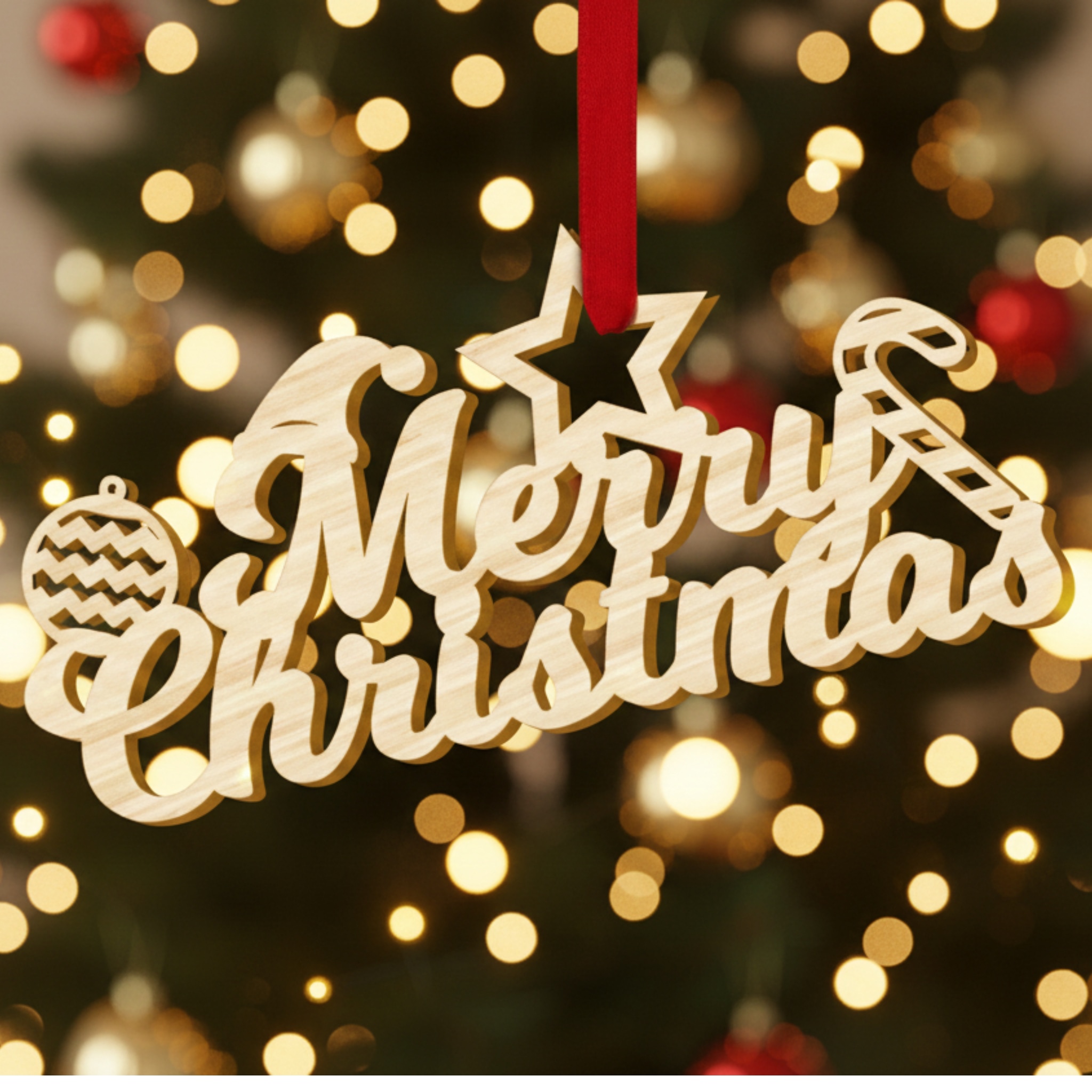 Merry Christmas Wooden Hanging Ornament for Tree | Laser Cut Xmas Decoration with Candy Cane & Star | Holiday Home Décor Gift – Lightweight & Durable