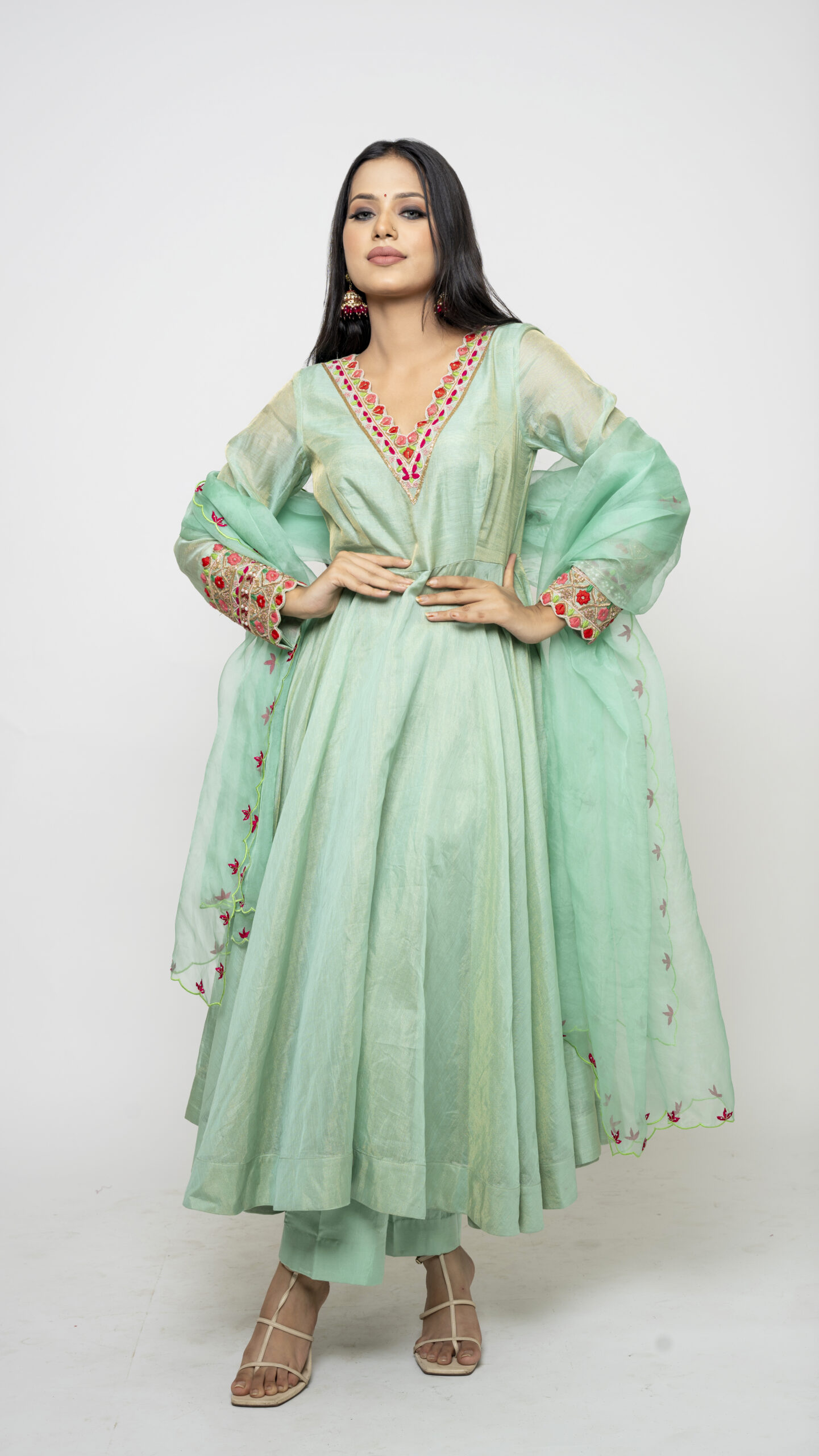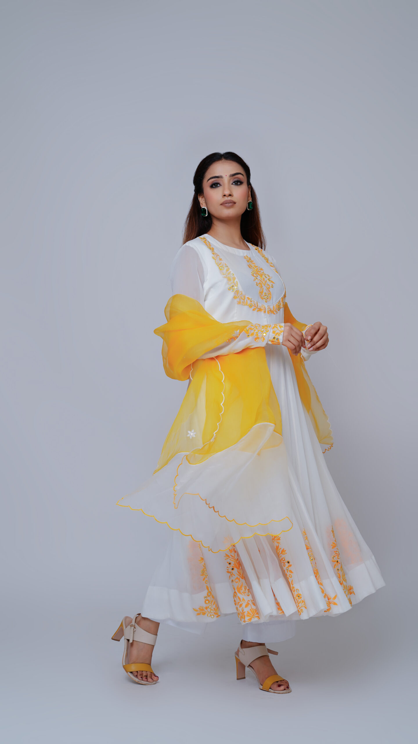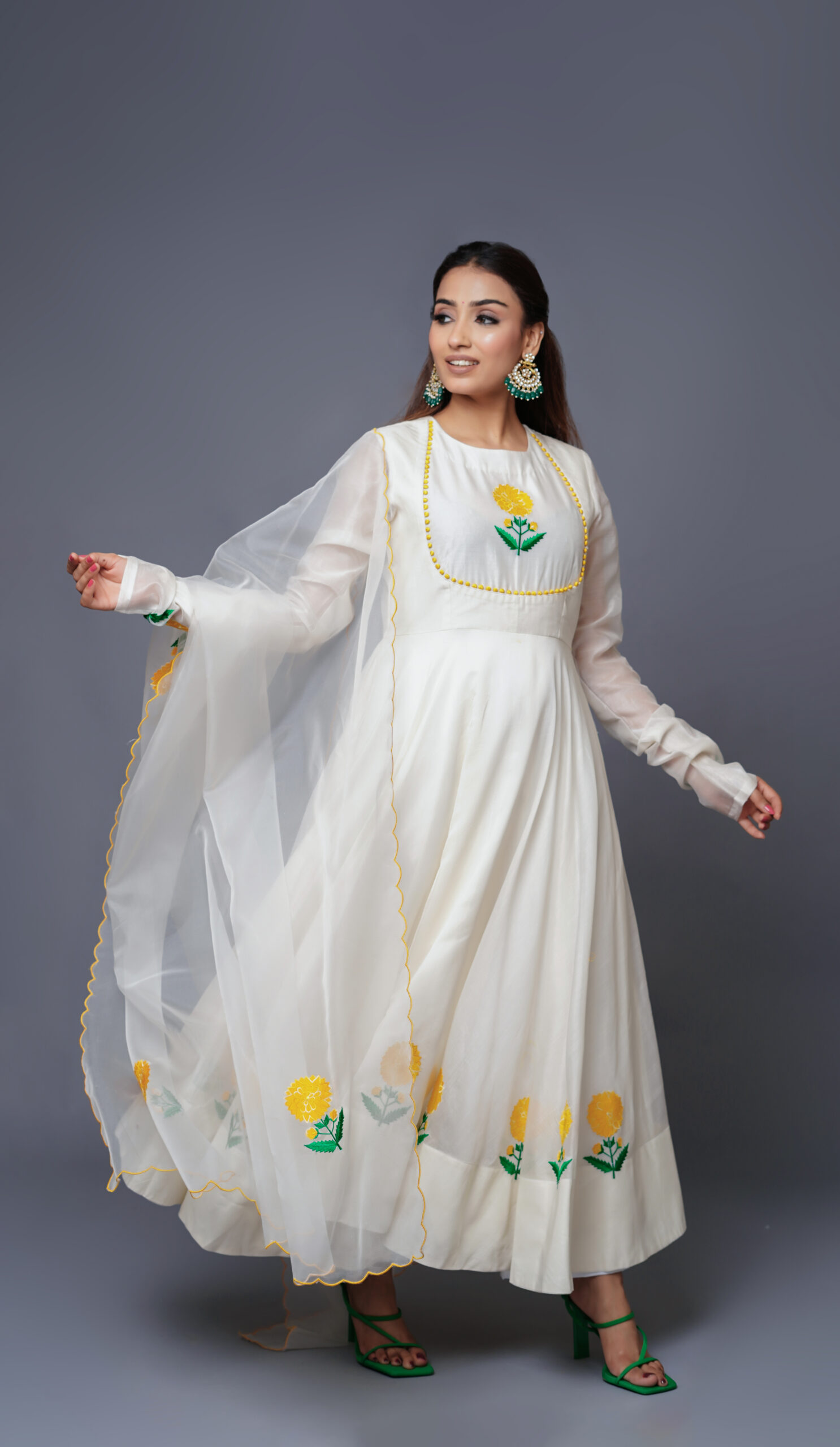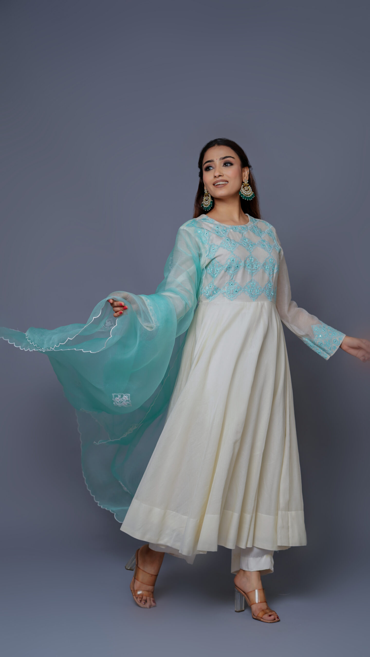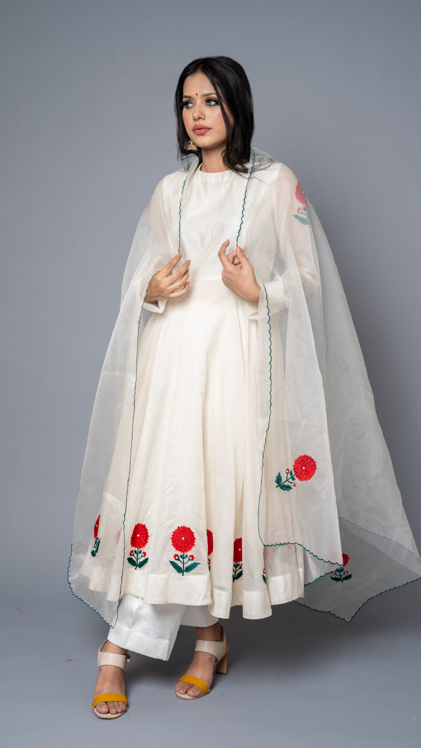 Off-White Chanderi Silk Anarkali Set with Organza Silk Dupatta
