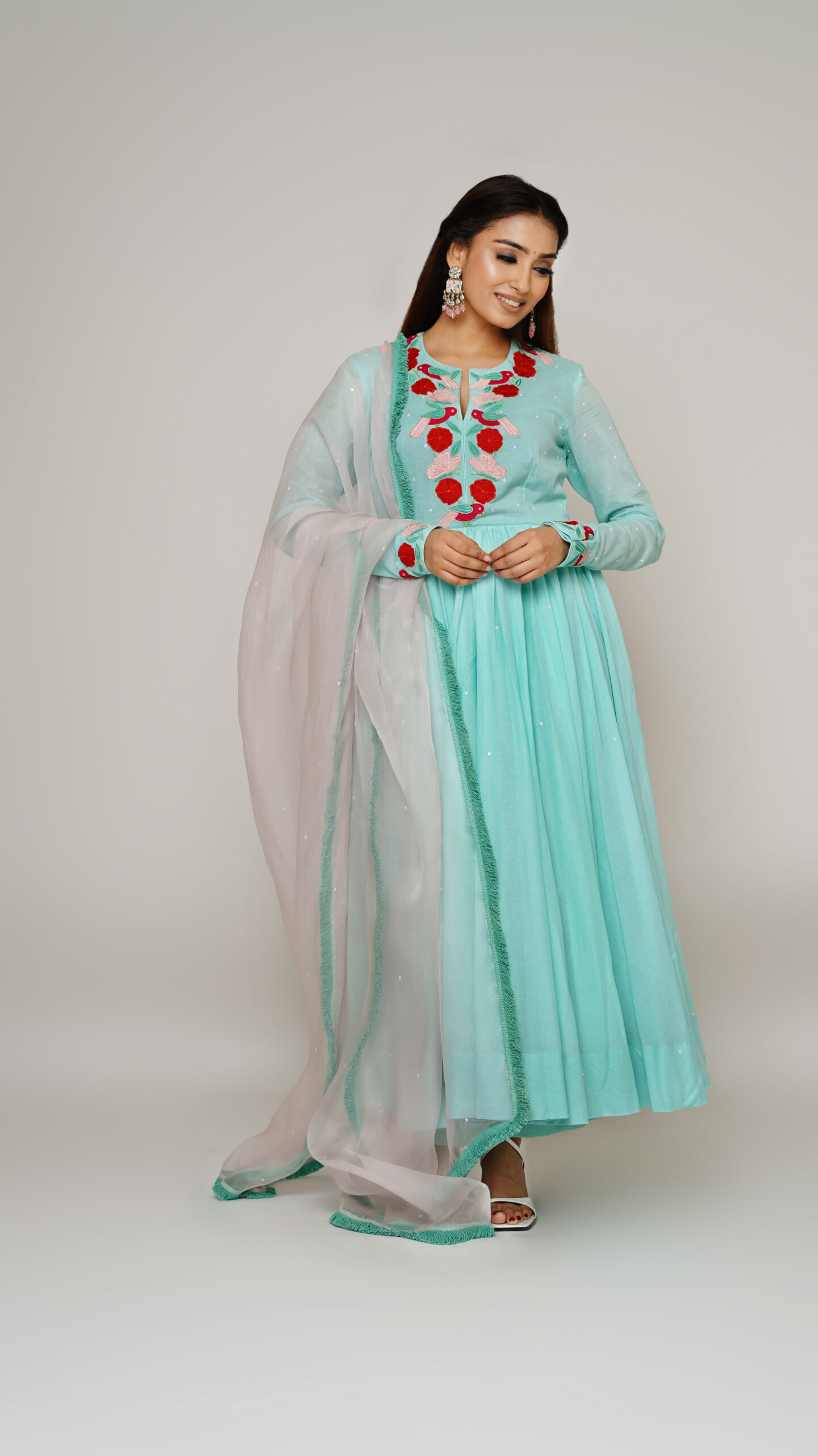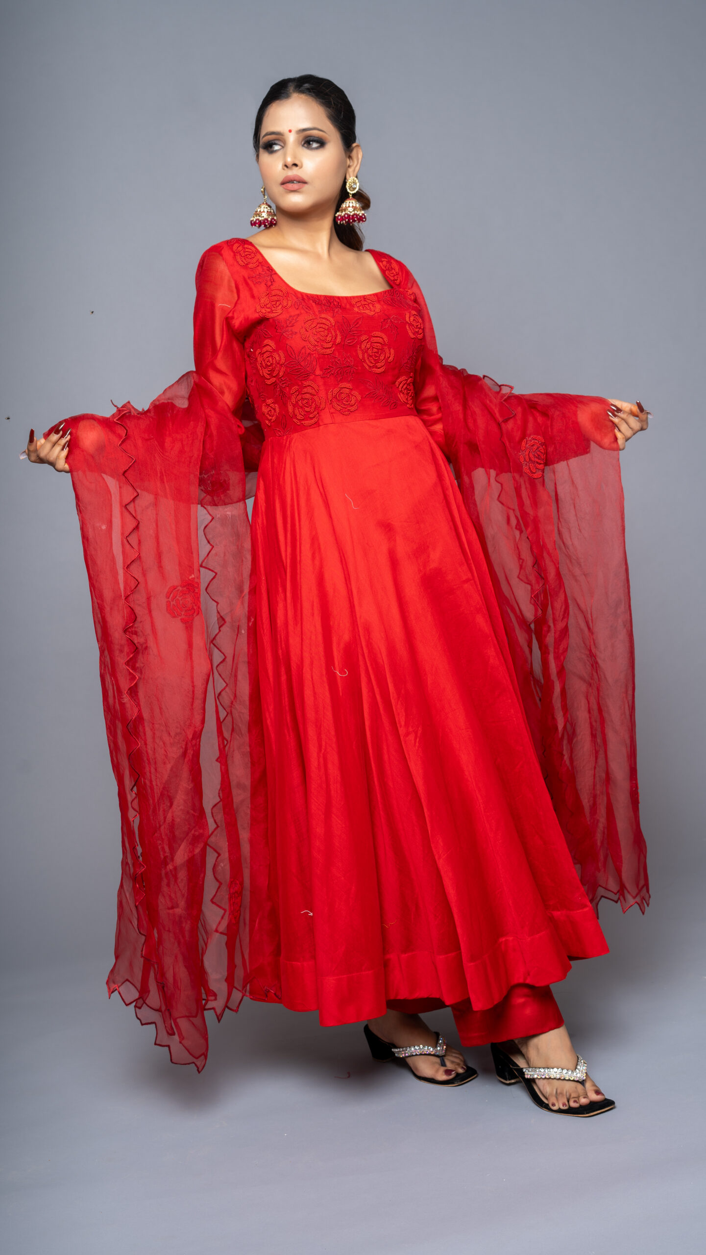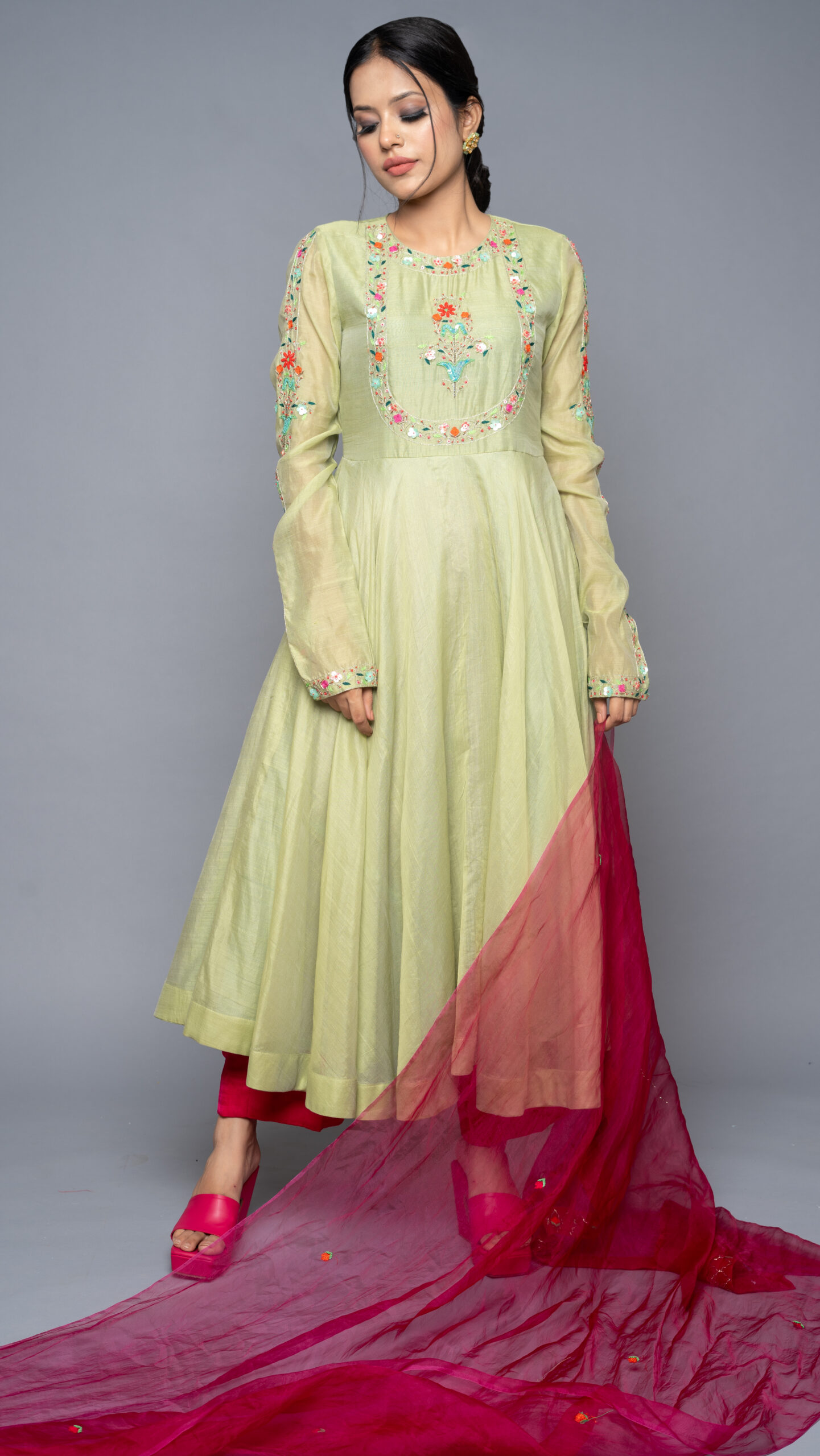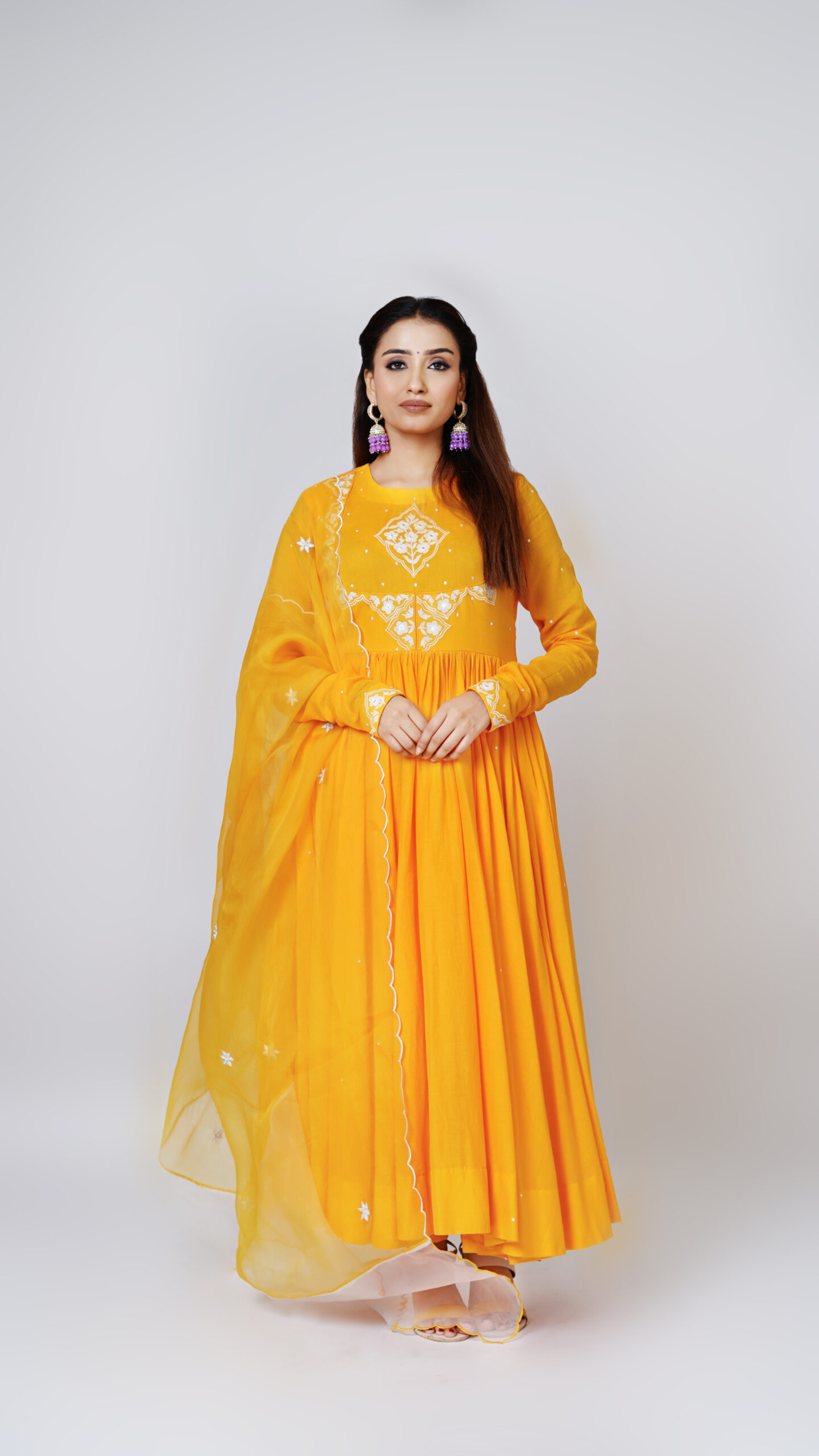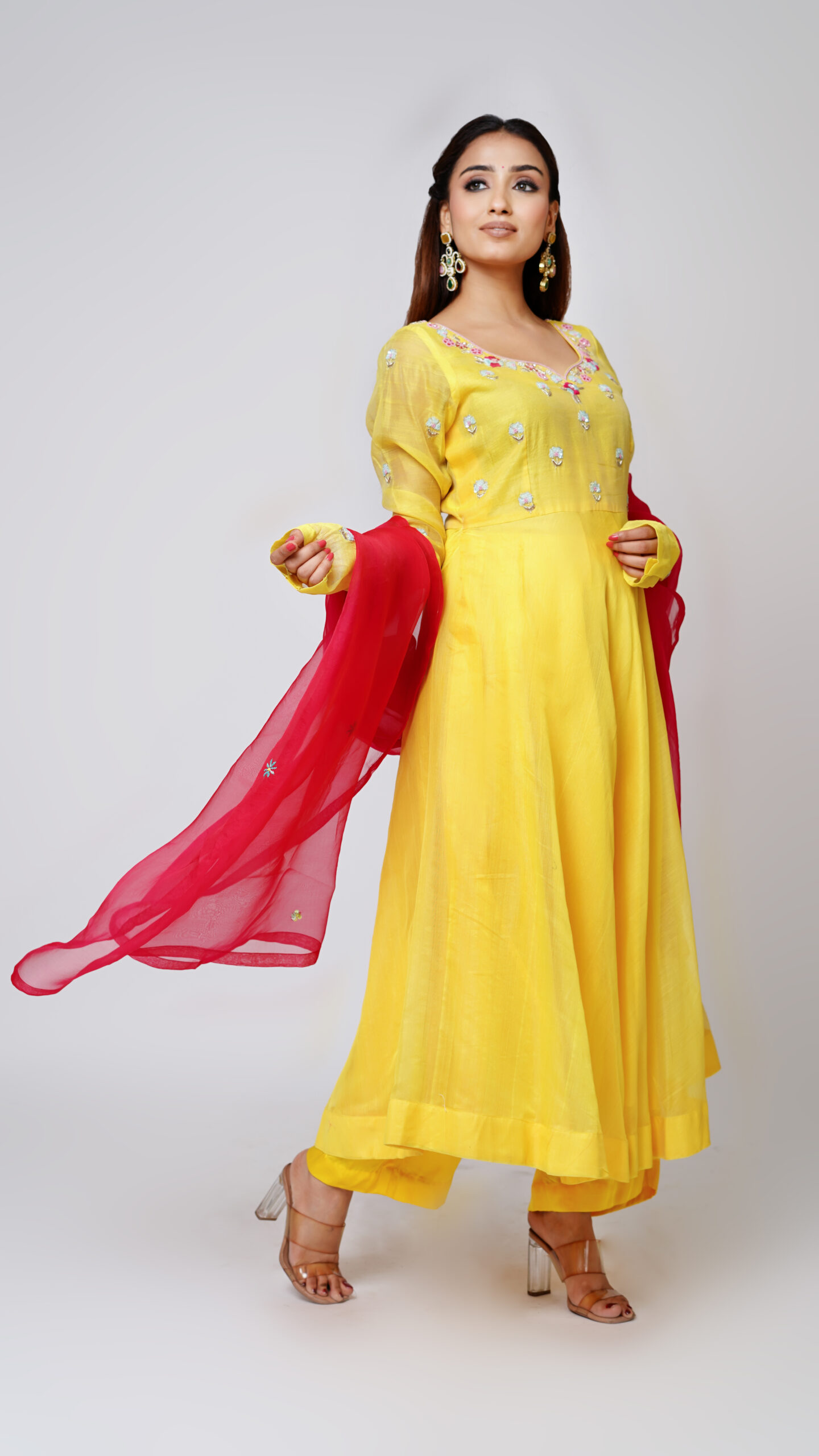 Yellow Embroidered Chanderi Silk Anarkali Set with Red Organza Dupatta