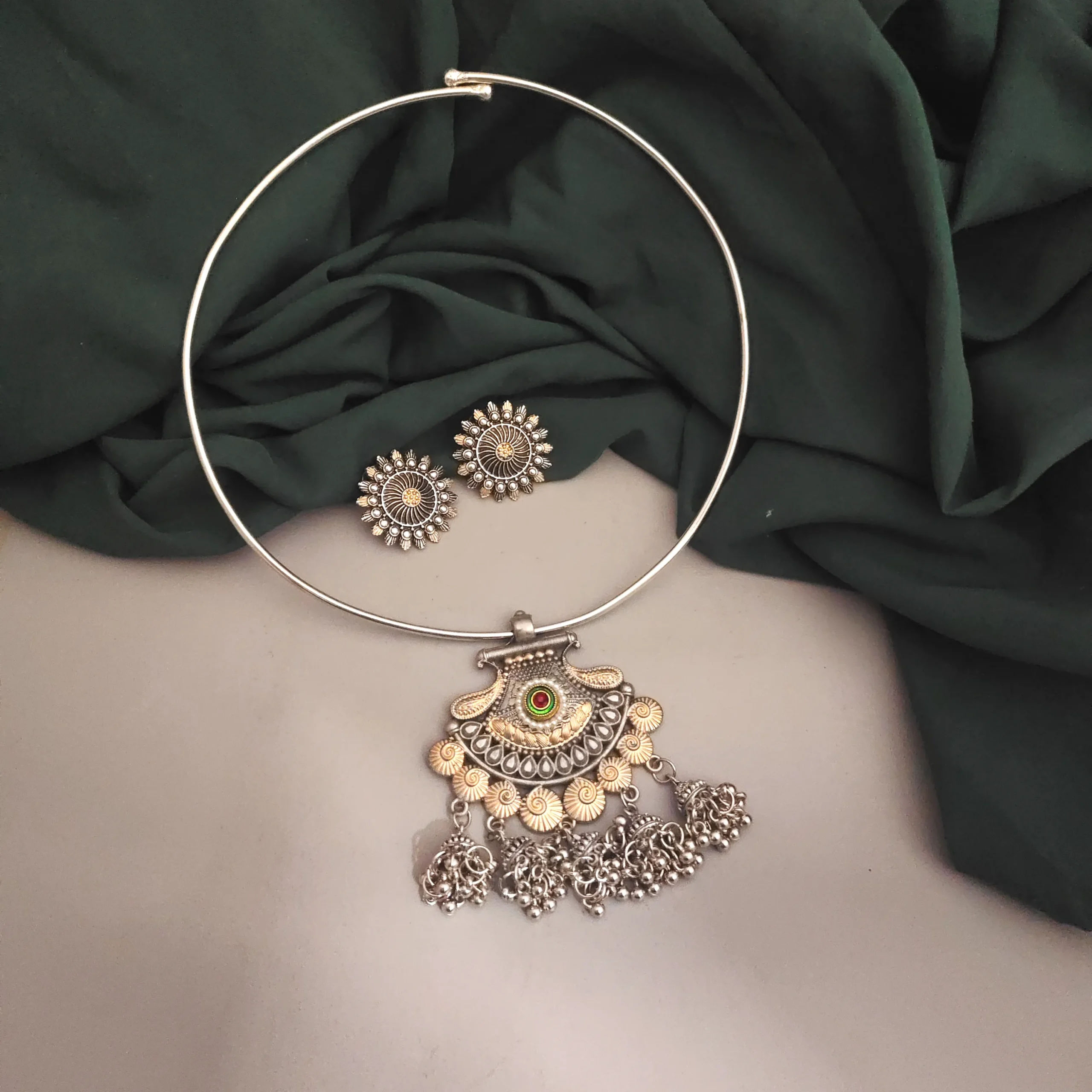 Mrida Oxidised Dual Tone Hasli Necklace Earring Set