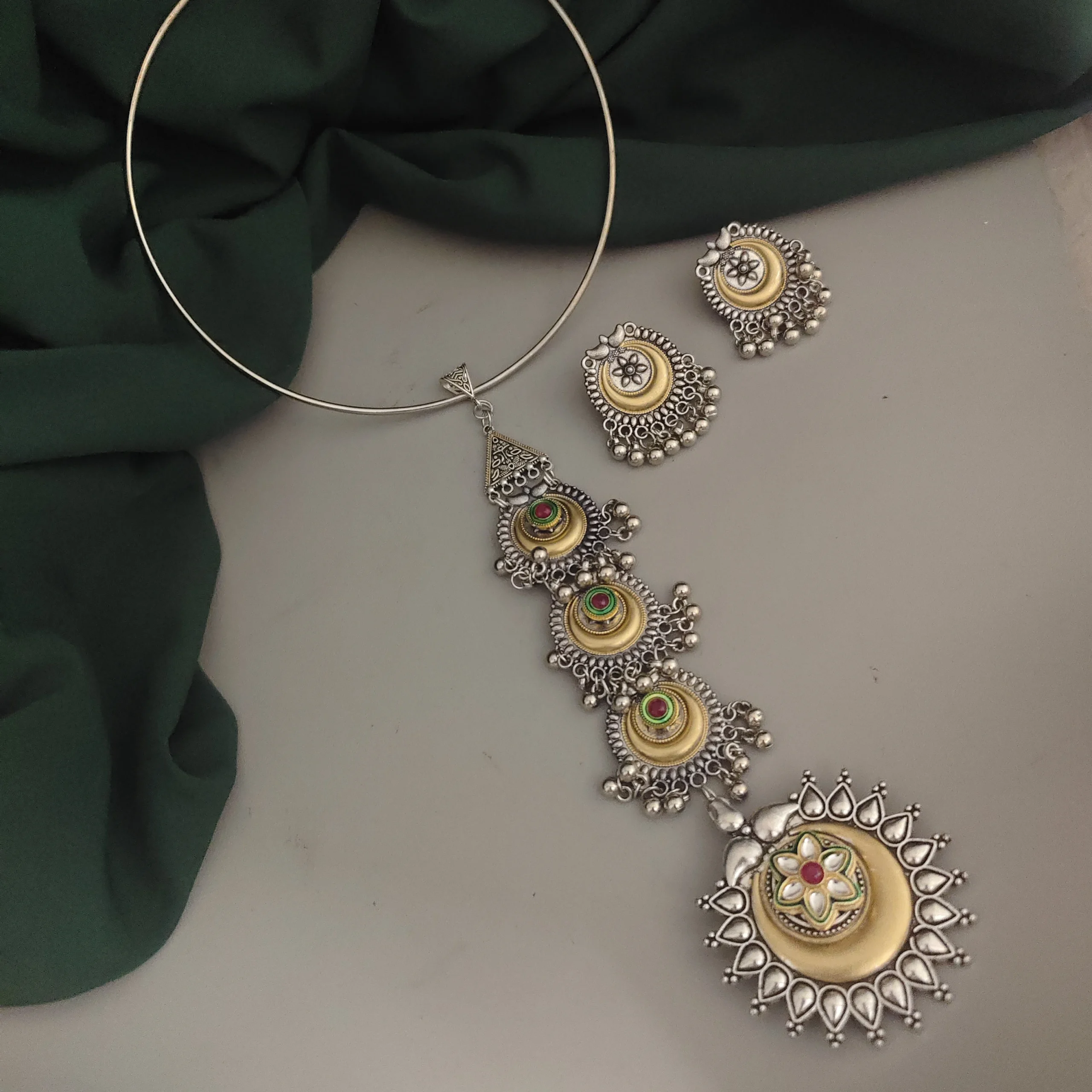 Simran Oxidised Two Tone Tie Necklace Earring Set
