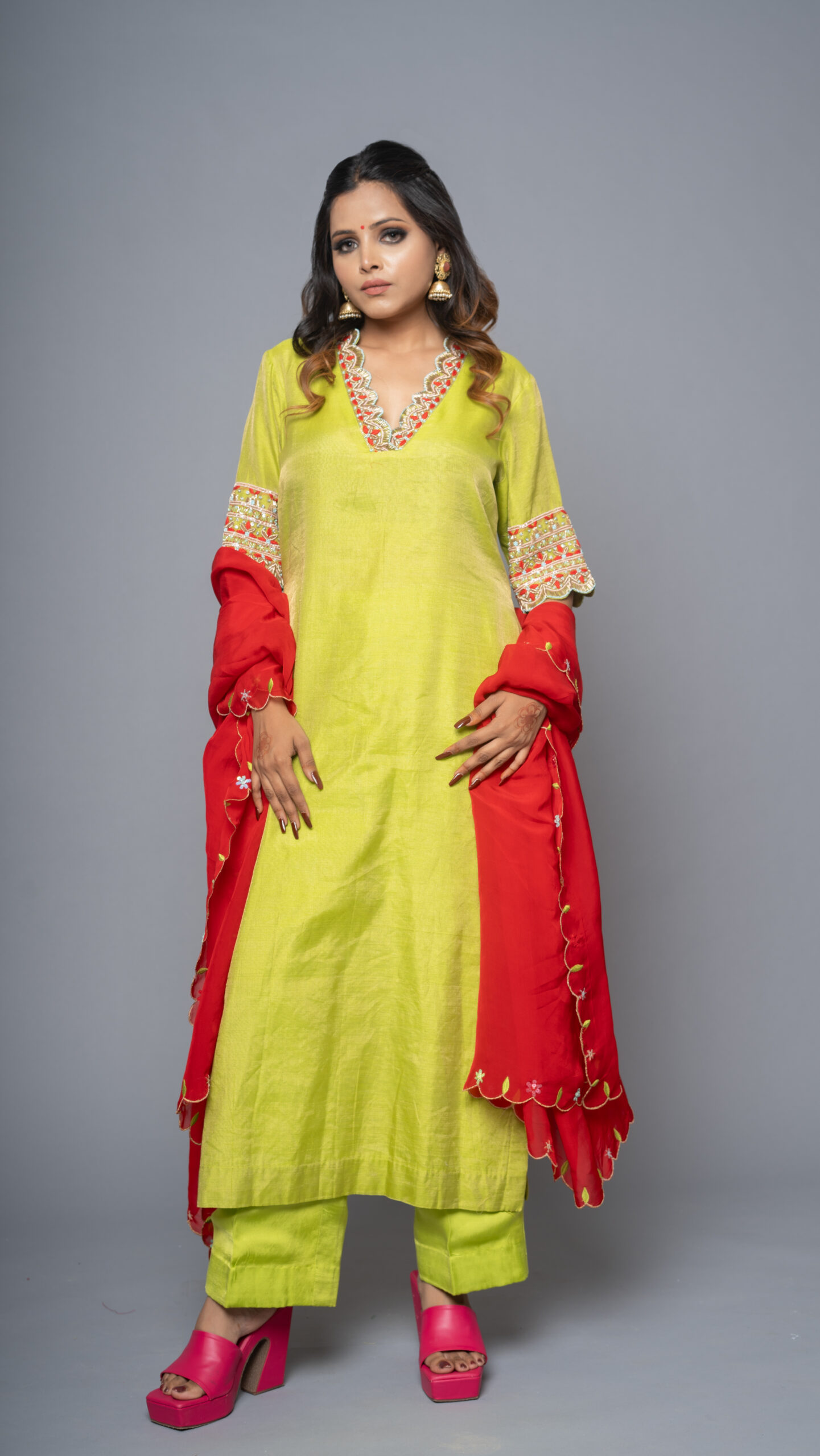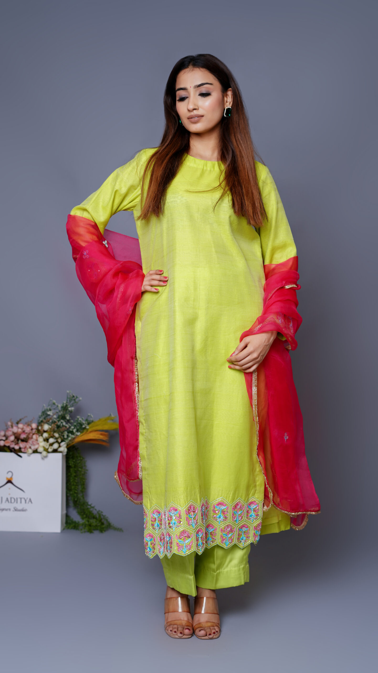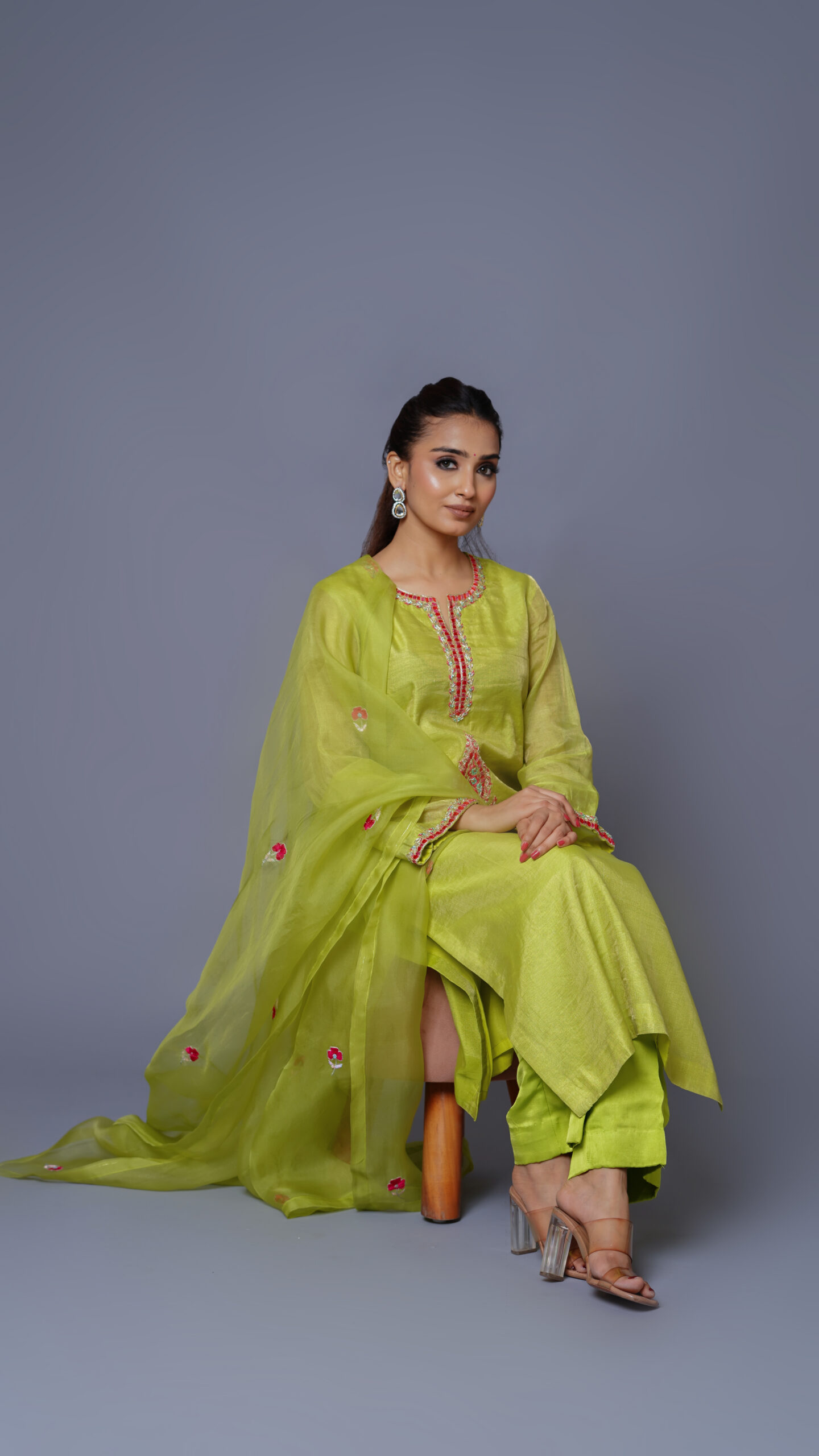 Neon Chanderi Silk Kurta Set with organza dupatta