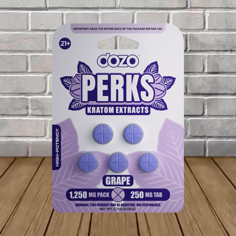 Description Dozo Perks Kratom Extract 1250mg Dozo Perks Kratom Extract 1250mg uses concentrated ingredients packed into convenient chewable tablets. The formula contains kratom alkaloids like mitragynine and 7-hydroxymitragynine, which many users associate with mood support, relaxation, and overall balance. The flavors help mask kratom’s natural bitterness and make the tablets easy to take on the go. Choose between Grape, Wild Mango, and Strawberry. Dozo Perks Kratom Extract 1250mg tablets offer a simple way to enjoy kratom for those who want kratom extract tablets that are convenient, flavorful, and reliable. How to Use Simply chew the Dozo Perks kratom extract tablet and swallow it. Some users let it soften in the mouth for a moment before chewing, which may help the ingredients absorb more quickly. Many people start with one tablet or even a half-tablet to see how their body responds. Kratom extracts are more concentrated than regular kratom leaf products, so starting low helps you find a comfortable serving. After taking it, wait about 30 to 60 minutes before deciding whether to take more. You can take it with water and work it into your normal routine. Some people prefer taking kratom earlier in the day, while others choose times when they want to relax and unwind. The key is to keep servings moderate and give the effects time to settle before taking another tablet. Do kratom extract tablets absorb faster than capsules? Many users feel that kratom extract chewable tablets can kick in a little faster than capsules. The exact timing can vary from person to person. Capsules must dissolve in the stomach before the kratom powder inside can begin absorbing, which can delay the onset. Chewable tablets work differently. When you chew them before swallowing, the tablet begins breaking down immediately in the mouth and continues dissolving once it reaches the stomach. This process may allow the kratom alkaloids to become available for absorption sooner. Several factors can still influence how quickly you notice the effects. Your metabolism, serving size, and food intake can all play a role. How long do kratom extract tablets typically last? The effects of kratom extract tablets can last different lengths of time depending on the person. Tolerance, metabolism, and the amount taken can all influence the overall experience. In general, many experienced kratom users say the effects tend to last around four to six hours. The effects may feel stronger or more noticeable at the beginning compared to regular kratom leaf products. However, the duration can still vary. Some users notice the effects build gradually, stay steady for a while, and then slowly fade over time. Taking moderate portions and giving the effects time to settle can help create a smoother, more predictable experience. Flavor Profiles The flavors smooth out kratom’s naturally bitter taste while adding a fruity twist, making the Dozo Perks chewable tablets easier and more enjoyable to take. Grape – A bold, juicy grape flavor with a candy-like sweetness. Wild Mango – A bright tropical mango taste with a slightly tangy finish. Strawberry – A sweet and lightly tart strawberry flavor. Product Features High-potency chewable kratom extract tablets Contains mitragynine and 7-hydroxymitragynine kratom alkaloids Available in Grape, Wild Mango, and Strawberry